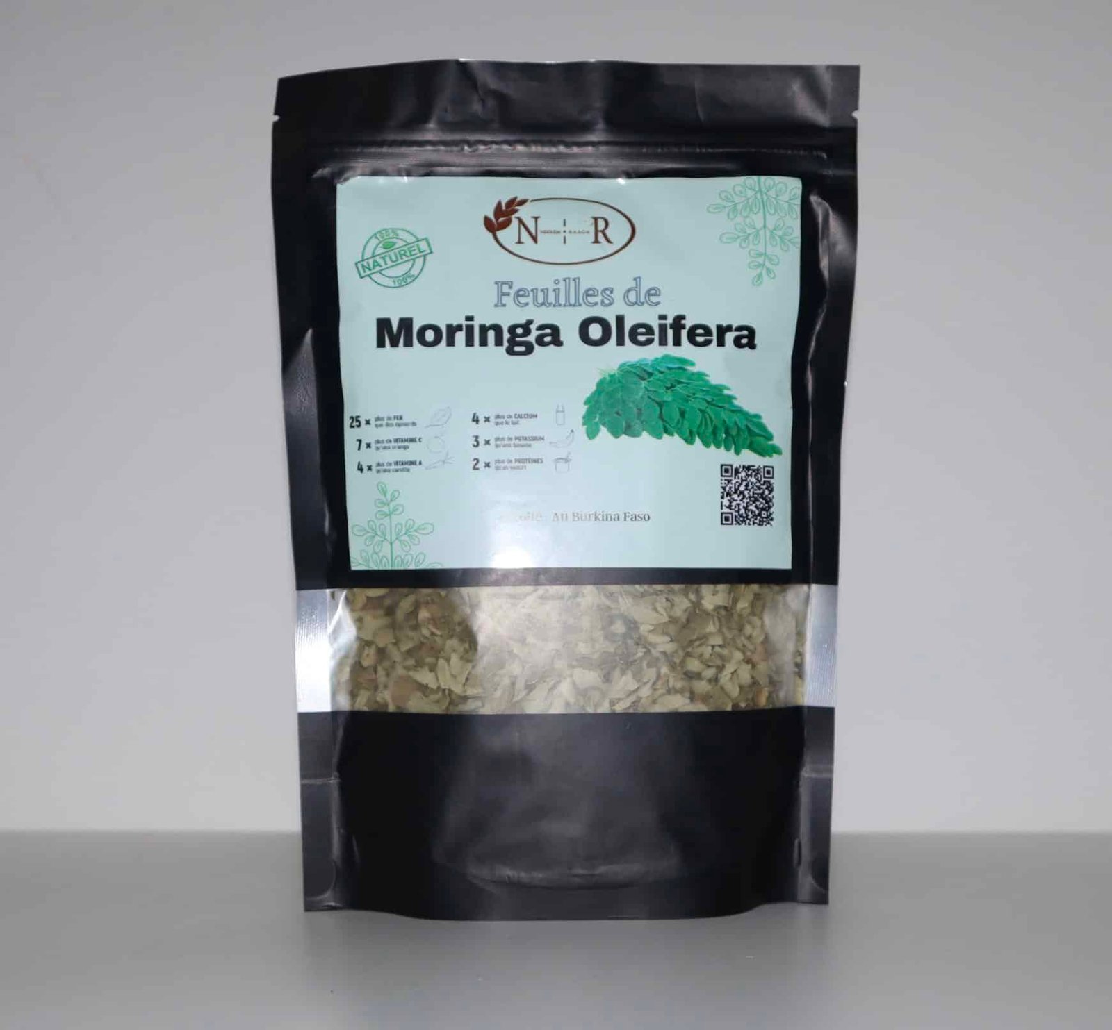 Sachet de 100 g – Feuilles entières de Moringa séchées naturellement, sans additifs ni conservateurs.